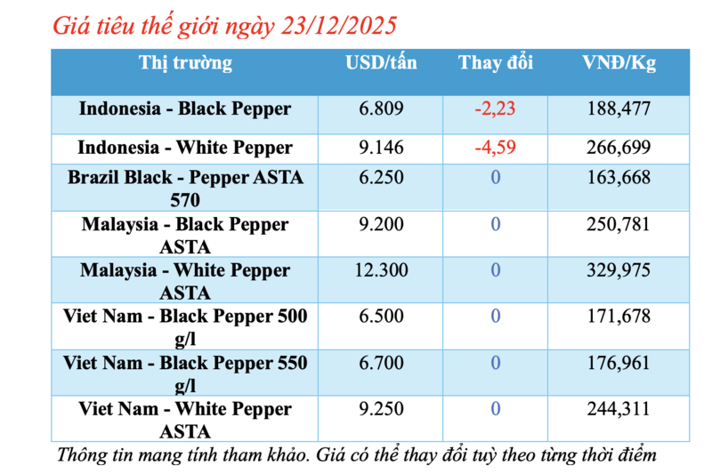 Cập nhật giá tiêu thế giới từ Hiệp hội Hồ tiêu Quốc tế (IPC) sáng 23/12/2025, hồ tiêu xuất khẩu hôm nay ghi nhận biến động mạnh từ thị trường Indonesia. Các thị trường khác đều ổn định giá so với phiên giao dịch hôm qua.