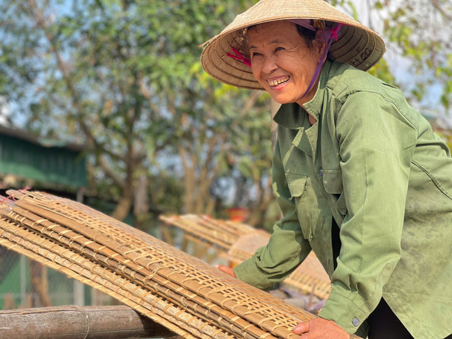 Trong số những lao động ấy có bà Nguyễn Thị Hiền (65 tuổi, quê Thạch Lạc, Hà Tĩnh). Gắn bó với công việc phơi và bóc tách bánh, mỗi ngày bà có thu nhập khoảng 250.000 đồng, góp phần ổn định cuộc sống từ chính làng nghề truyền thống.