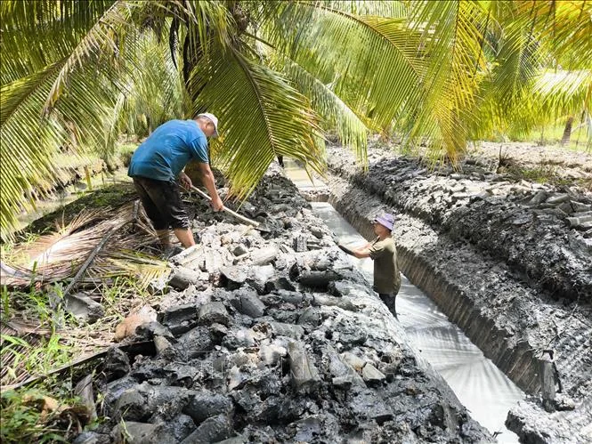 Nông dân bồi phù sa cho vườn dừa giúp giữ ẩm cho đất ứng phó hạn mặn. Ảnh: Huỳnh Phúc Hậu/TTXVN