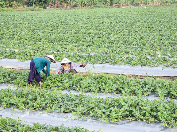 Hiện nay, tại nhiều xã, phường trên địa bàn TP Cần Thơ đã hình thành được các vùng sản xuất rau màu tập trung, chuyên canh. Nhiều loại rau màu được nông dân sản xuất quanh năm, nhưng trồng nhiều vẫn là vụ Tết nhằm đáp ứng nhu cầu tiêu thụ tăng cao của thị trường. Theo ông Phan Quốc Hội ở ấp Thới Phong A, xã Thới Lai, tại địa phương đã hình thành một số vùng chuyên canh trồng rau màu khá lớn, nông dân trồng nhiều loại rau màu quanh năm như dưa hấu, bầu bí, mướp hương, bắp, khổ qua, dưa leo, ớt… Trong đó, dưa hấu được nhiều hộ dân chọn trồng và tập trung trồng nhiều vào vụ Tết. Để phục vụ thị trường Tết Nguyên đán 2026, ông Hội đã gieo trồng 7 công dưa hấu. Nhờ ứng dụng các tiến bộ kỹ thuật vào sản xuất, đặc biệt là sử dụng màng phủ nông nghiệp để đậy gốc dưa giúp gia đình giảm chi phí làm cỏ, tưới nước nhưng dưa hấu vẫn đạt năng suất khá cao, có thể lên đến trên 3 tấn/công, khả năng đạt lợi nhuận 10-15 triệu đồng/công.