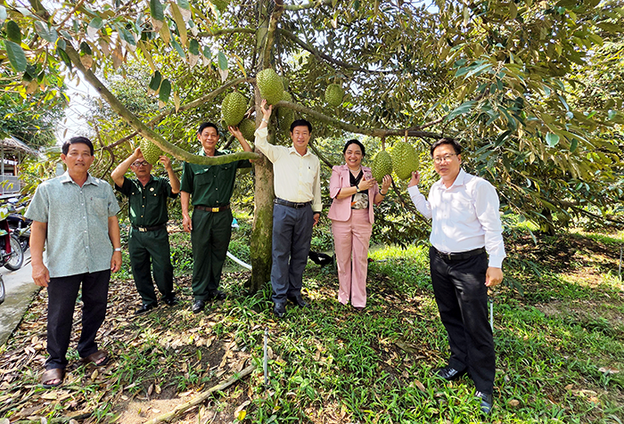 Đại biểu tham quan vườn sầu riêng tại Tổ hợp tác làm vườn 30-4 ở xã Trường Thành.