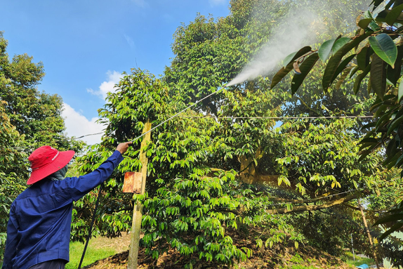 Nông dân chăm sóc vườn sầu riêng tại phường Cái Răng.