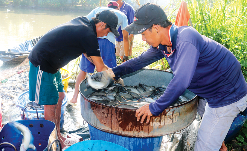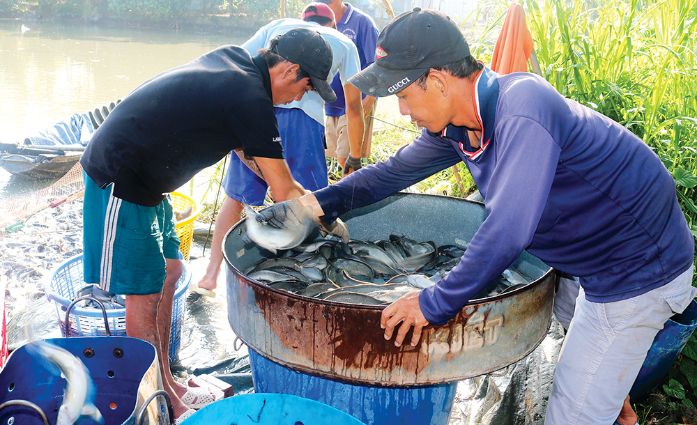 Thu hoạch cá trê nuôi ở xã Vĩnh Trinh, TP Cần Thơ.