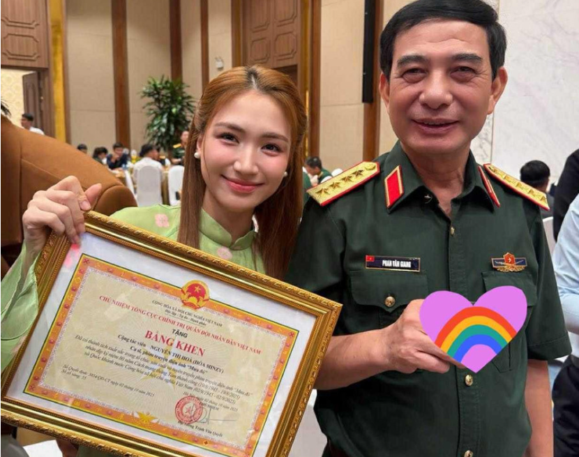 Nữ ca sĩ Hòa Minzy đứng cạnh Bộ trưởng Bộ Quốc phòng Phan Văn Giang, bày tỏ niềm tự hào khi nhận bằng khen.