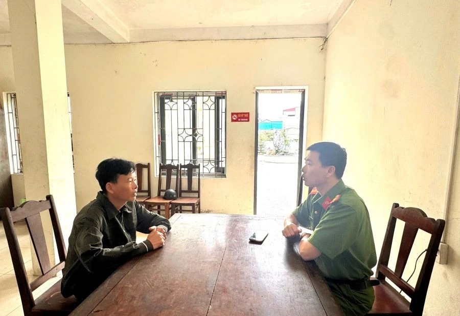 | Đối tượng Khuất Văn Sinh (bên trái) tại cơ quan công an (ảnh: Công an tỉnh Phú Thọ). |