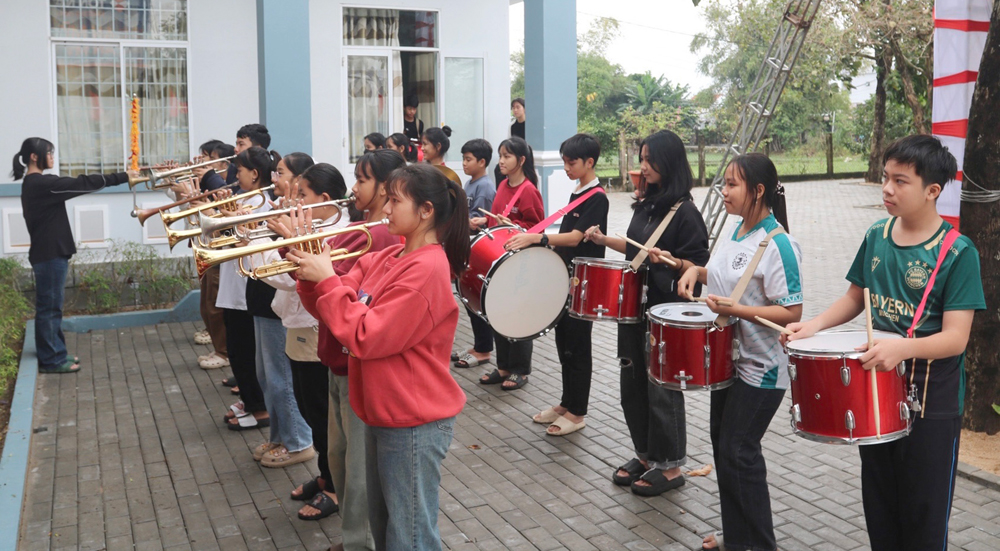 Học sinh Trường THCS Nguyễn Thái Bình hăng say luyện tập kèn trống đội để biểu diễn chào mừng Đại hội đại biểu Đảng bộ xã An Mỹ lần thứ XVI |