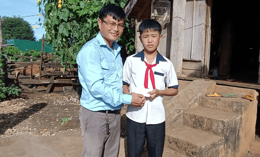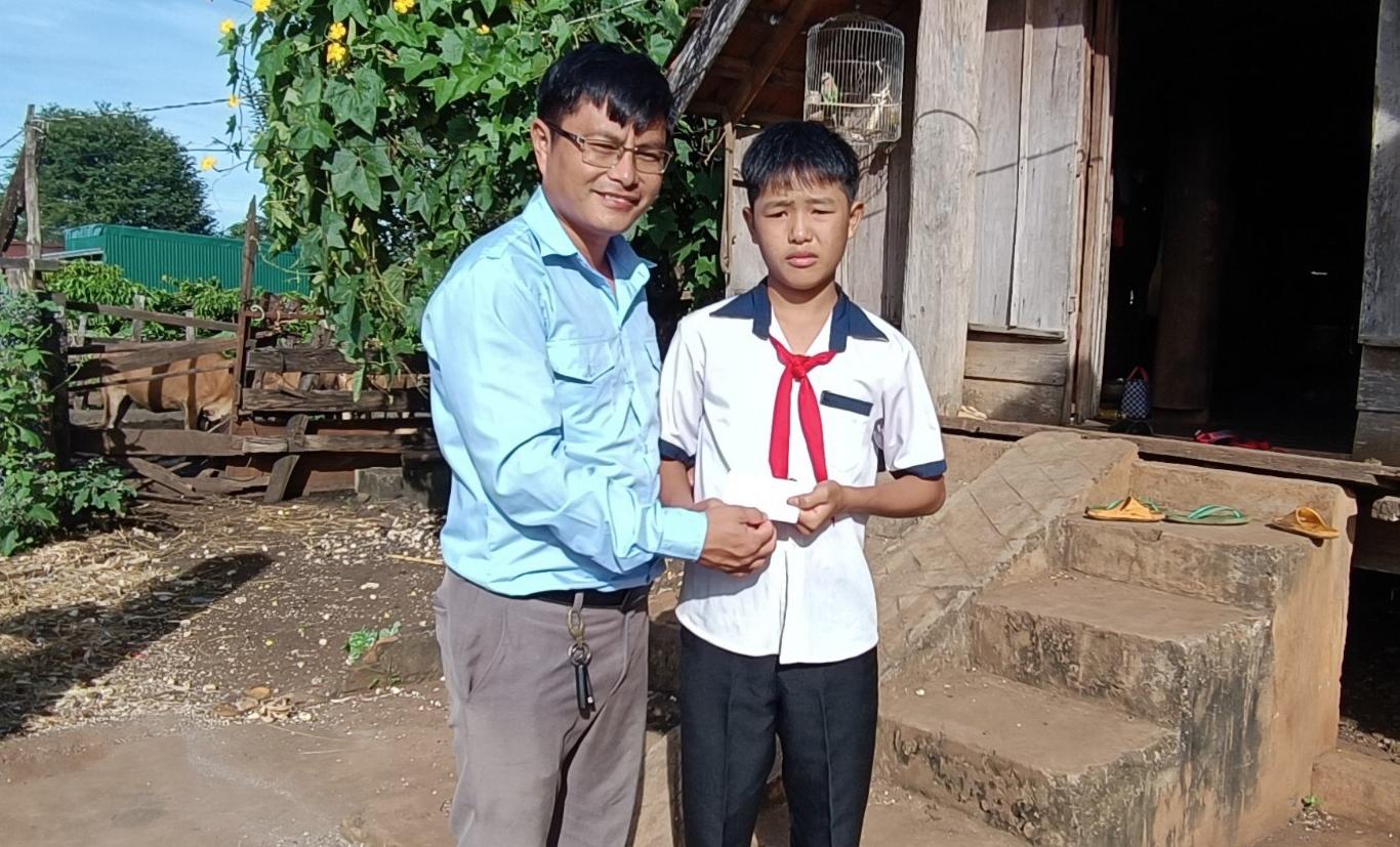 Thầy Mai Văn Chuyền trao thẻ bảo hiểm y tế tặng em Y Yê Ăng Kbuôr (dân tộc Êđê, lớp 9B, Trường THCS Ngô Mây). |