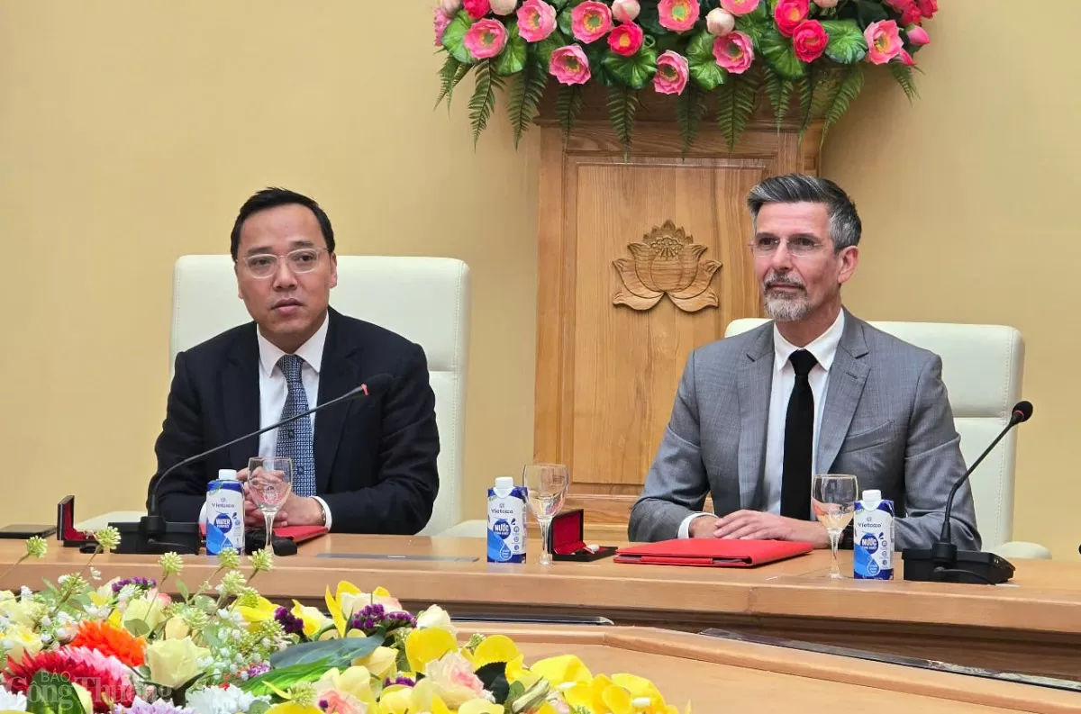 Thứ trưởng Bộ Công Thương Nguyễn Hoàng Long và ông Augusto -Tổng Giám đốc Công ty TNHH Năng lượng Mêkông. Ảnh: Thu Hường |