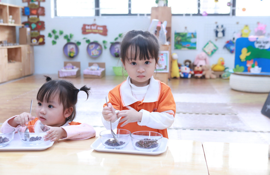 Trẻ tại Trường Mầm non Bắc Từ Liêm (Tây Tựu, Hà Nội) trong một hoạt động trên lớp. Ảnh: Đình Tuệ