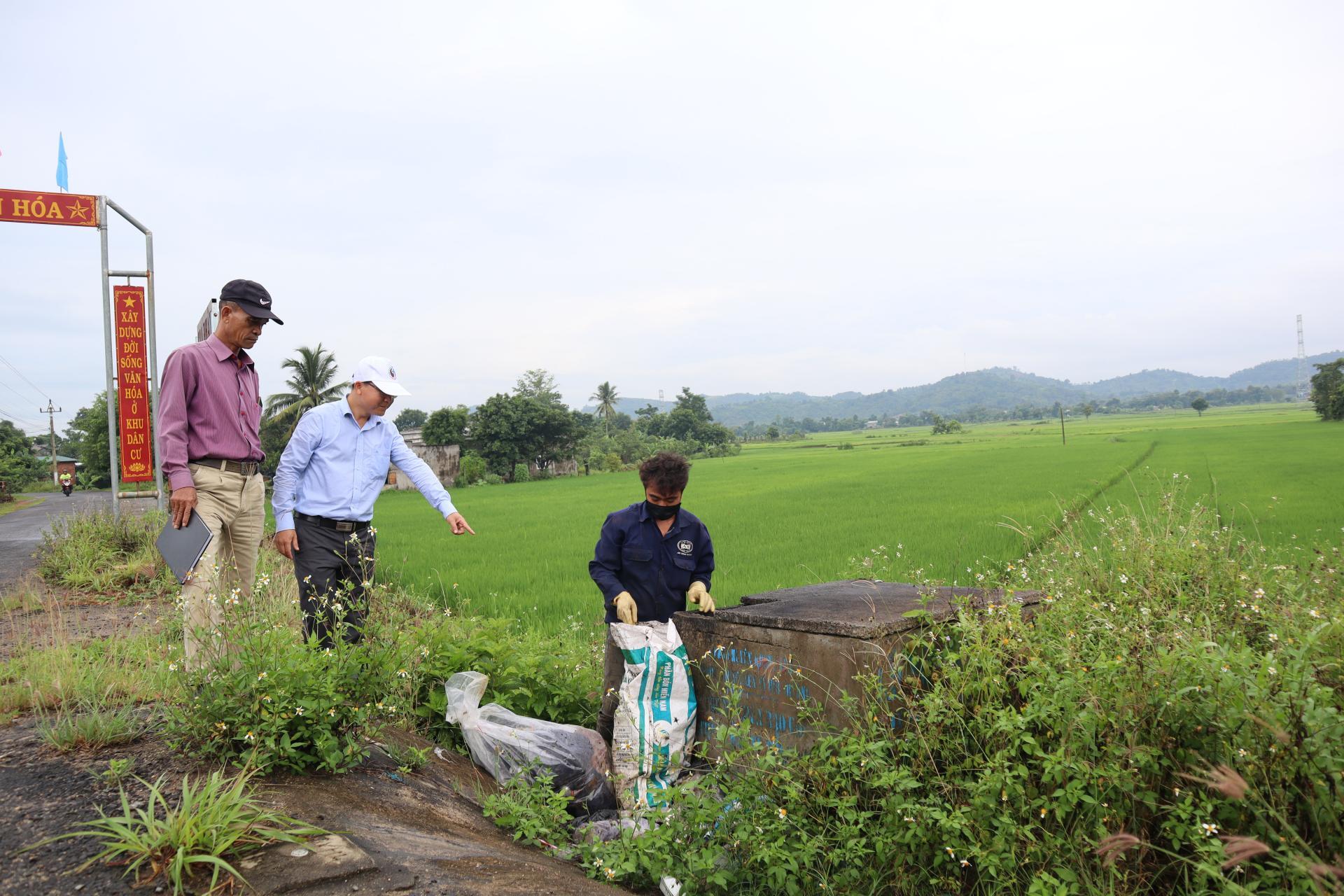 Cán bộ Phòng Tài nguyên và Môi trường huyện kiểm tra bể chứa rác thải thuốc bảo vệ thực vật trên địa bàn xã Dray Sáp (huyện Krông Ana). |