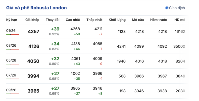 Kết thúc phiên giao dịch gần nhất, giá cà phê Robusta tại London đồng loạt tăng nhẹ qua các kỳ giao hàng. Cụ thể, kỳ giao tháng 1/2026 tăng nhẹ 39 USD/tấn, đạt mức 4257 USD/tấn. Trong khi hợp đồng giao kỳ hạn tháng 9/2026 tăng 27 USD/tấn, lên mức 3965 USD/tấn.