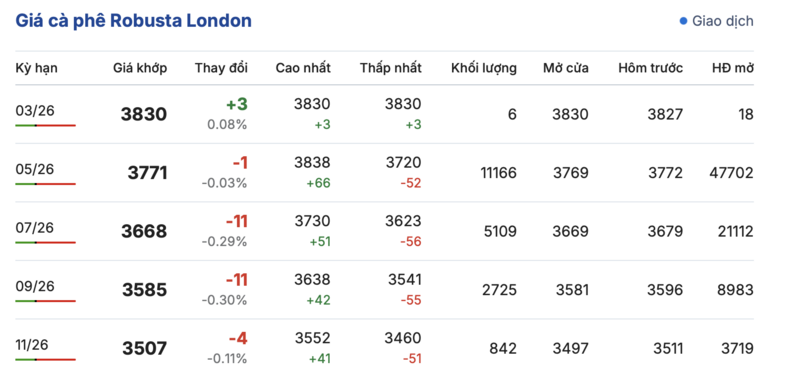 Cụ thể, kết thúc phiên giao dịch gần nhất, giá cà phê Robusta tại London ghi nhận phiên biến động trái chiều trong các kỳ giao hàng. Trong đó, kỳ giao tháng 1/2026 tăng nhẹ 3,0 USD/tấn, đạt mức 3830 USD/tấn. Trái lại, hợp đồng giao kỳ hạn tháng 11/2026 giảm nhẹ 4,0 USD/tấn, xuống mức 3507 USD/tấn.