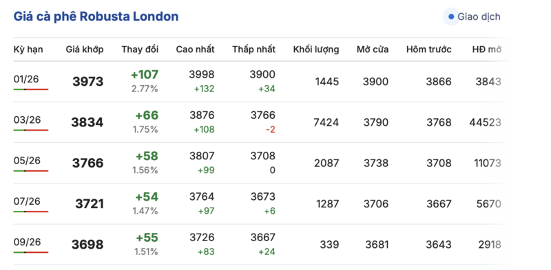 Kết thúc phiên giao dịch gần nhất, giá cà phê Robusta tại London tăng mạnh đồng loạt trong các kỳ giao hàng. Cụ thể, kỳ giao tháng 1/2026 tăng mạnh 107 USD/tấn, lên mức 3973 USD/tấn. Hợp đồng giao kỳ hạn tháng 9/2026 tăng 55 USD/tấn, lên mức 3698 USD/tấn.
