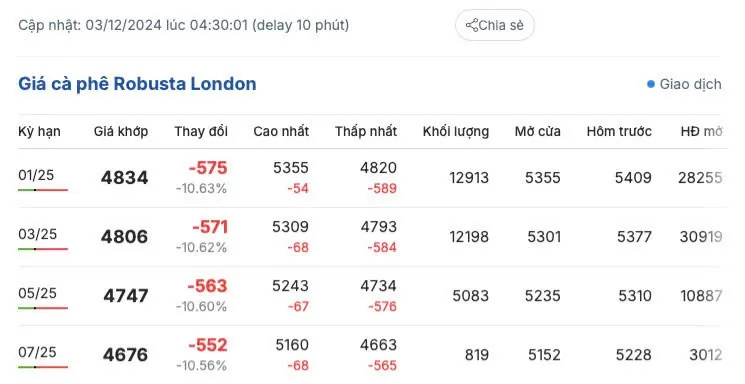 Giá cà phê Robusta trên sàn London ngày 3/12/2024 |