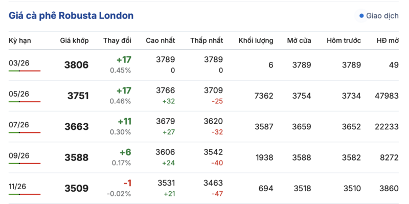Cụ thể, kết thúc phiên giao dịch gần nhất, giá cà phê Robusta tại London ghi nhận phiên tăng giảm đan xen trong các kỳ giao hàng. Trong đó, kỳ giao tháng 1/2026 tăng nhẹ 17 USD/tấn, đạt mức 3806 USD/tấn. Trái lại, hợp đồng giao kỳ hạn tháng 11/2026 lại giảm nhẹ 1,0 USD/tấn, xuống mức 3509 USD/tấn.