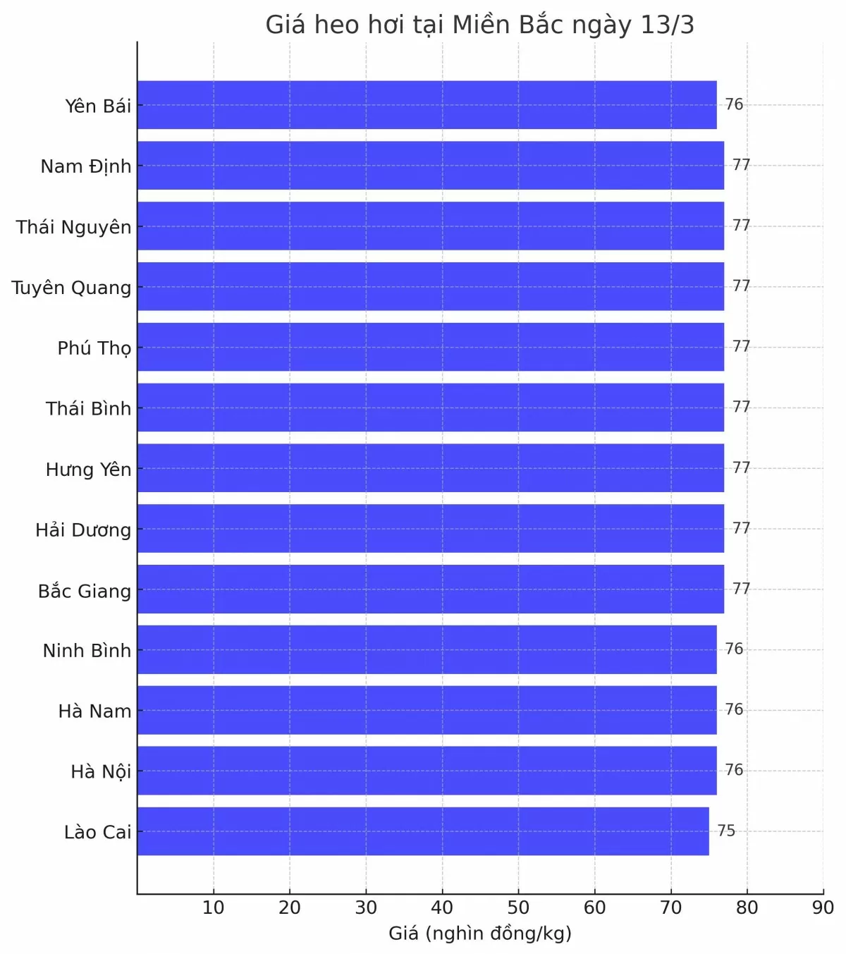 Giá heo hơi tại miền Bắc ngày 13/3 tiếp tục có xu hướng giảm nhẹ so với ngày 12/3. Cụ thể, giá tại Hà Nội giảm 1.000 đồng/kg xuống còn 76.000 đồng/kg, trong khi Lào Cai cũng giảm 1.000 đồng/kg, còn 75.000 đồng/kg.