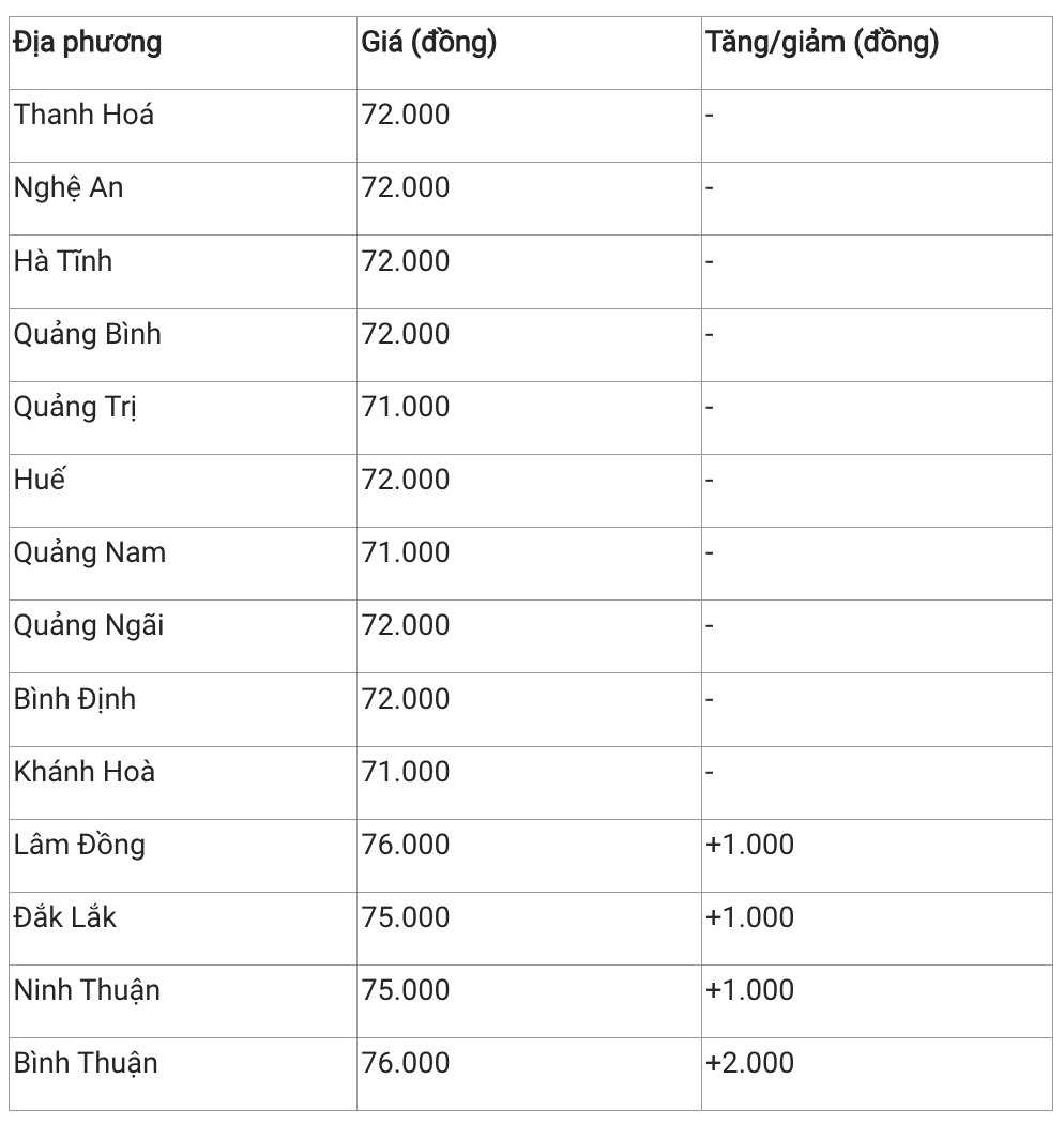 Hiện giá heo hơi khu vực này dao động 71.000 – 76.000 đồng/kg. Với việc tăng giá trong phiên sáng nay, Lâm Đồng đang là địa phương có giá cao nhất khu vực với 76.000 đồng/kg, tiếp đến Đắk Lắk, Bình Thuận có giá 75.000 đồng/kg. Ngược lại, Quảng Trị, Khánh Hoà bán heo hơi thấp nhất khu vực với mức 71.000 đồng/kg.