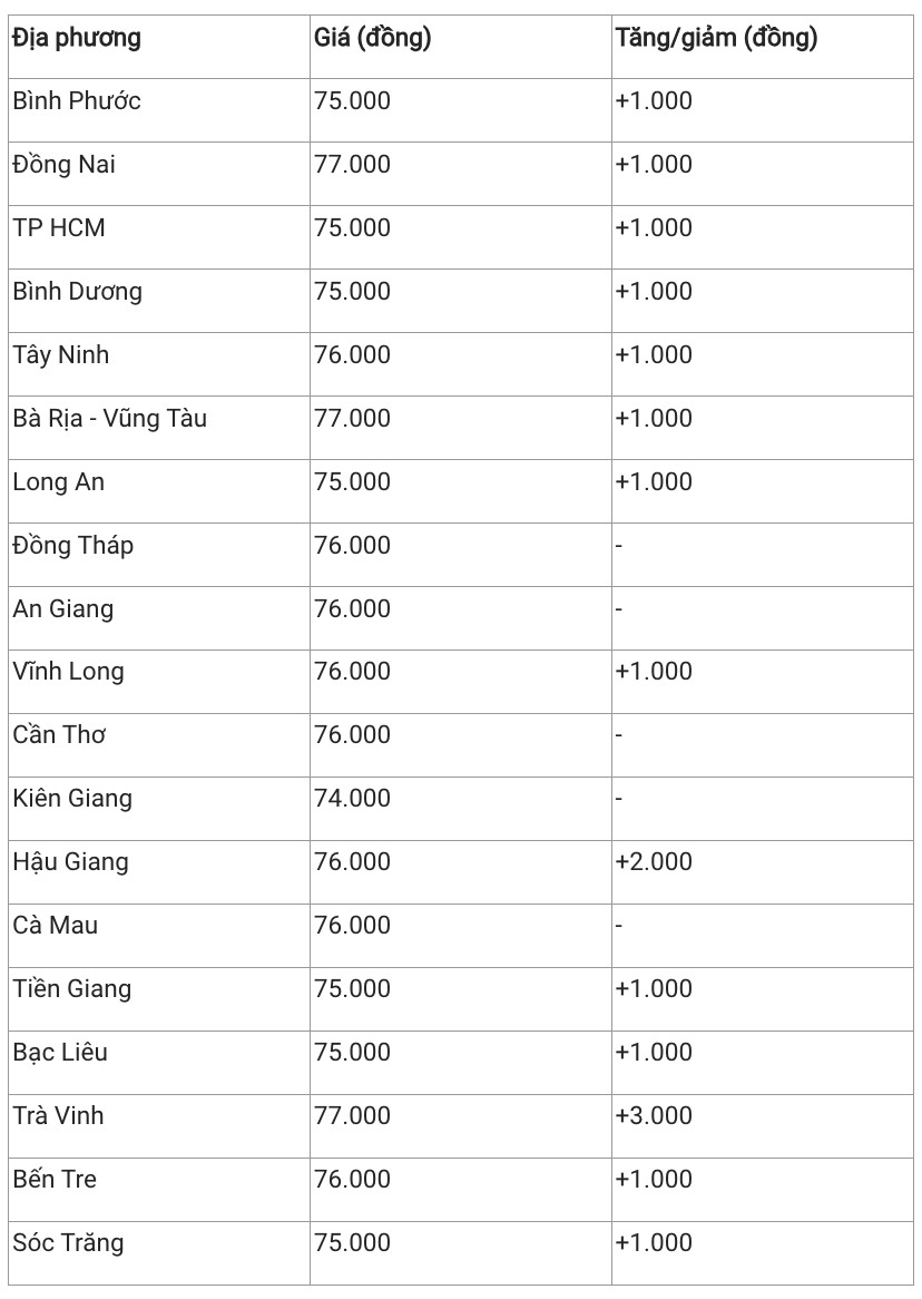 Giá heo hơi tại khu vực miền Nam hôm nay (24/2/2025) ghi nhận đà tăng mạnh ở hầu hết các tỉnh thành. Trong đó, các tỉnh Bình Phước, Đồng Nai, TP. Hồ Chí Minh, Bình Dương, Tây Ninh, Bà Rịa – Vũng Tàu, Long An, Vĩnh Long, Tiền Giang, Bạc Liêu, Bến Tre, Sóc Trăng cùng tăng 1.000 đồng/kg, còn Hậu Giang tăng 2.000 đồng/kg. Đặc biệt, Trà Vinh tăng tới 3.000 đồng/kg, cùng giá Đồng Nai, Cần Thơ, Bà Rịa - Vũng Tàu đạt ngưỡng 77.000 đồng/kg.