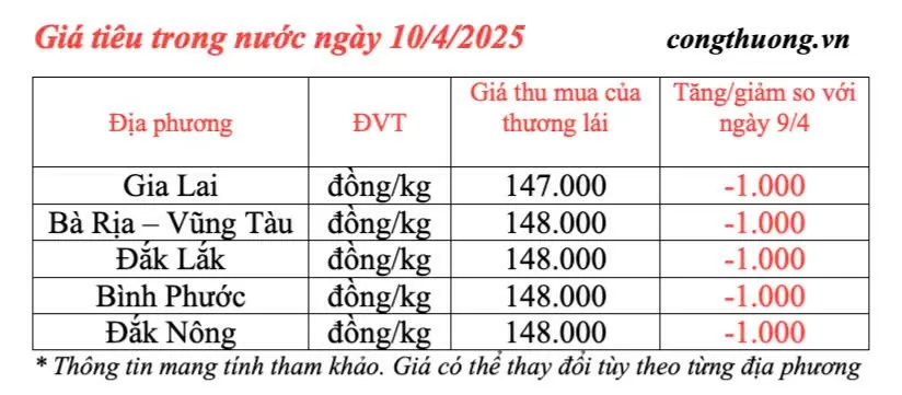 Giá tiêu hôm nay được cập nhật lúc 4h30 sáng ngày 10/4/2025 như sau, thị trường tiêu trong nước tiếp đà giảm, mức giảm 1.000 đồng/kg so với phiên giao dịch hôm qua. Hiện giá tiêu thu mua trung bình tại các địa bàn trọng điểm là 147.800 đồng/kg.