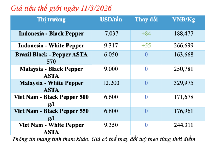 Giá tiêu thế giới hôm nay 11/3/2026: Tiêu Indonesia tăng mạnh