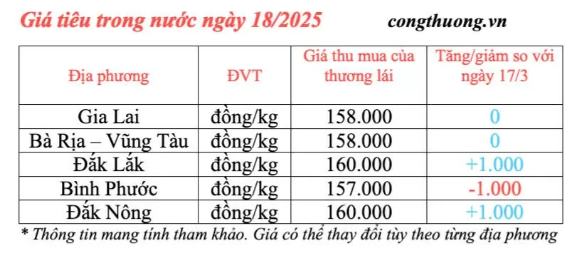 Giá tiêu hôm nay được cập nhật lúc 4h30 sáng ngày 18/3/2025 như sau, giá tiêu trong nước có sự chênh lệch tăng - giảm nhẹ giữa các địa phương so với phiên giao dịch trước đó. Hiện giá tiêu thu mua trung bình tại các địa bàn trọng điểm là 158.600 đồng/kg.