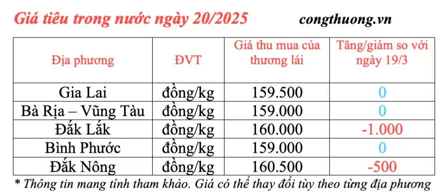 Giá tiêu hôm nay được cập nhật lúc 4h30 sáng ngày 20/3/2025 như sau, thị trường bình ổn và giảm nhẹ ở tỉnh Đắk Lắk và Đắk Nông, mức giảm từ 500 - 1.000 đồngkg so với hôm qua. Hiện giá tiêu thu mua trung bình tại các địa bàn trọng điểm là 159.600 đồng/kg.