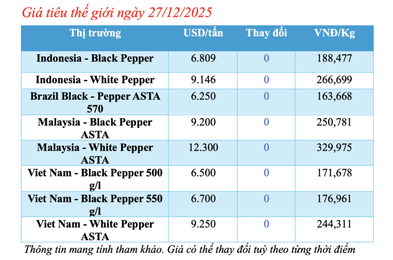 Cập nhật giá tiêu thế giới từ Hiệp hội Hồ tiêu Quốc tế (IPC) sáng 27/12/2025, hồ tiêu xuất khẩu hôm nay không ghi nhận biến động. Các thị trường đều ổn định giá so với phiên giao dịch hôm qua.