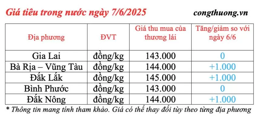 | Giá tiêu trong nước cập nhật sáng ngày 7/6/2025 |