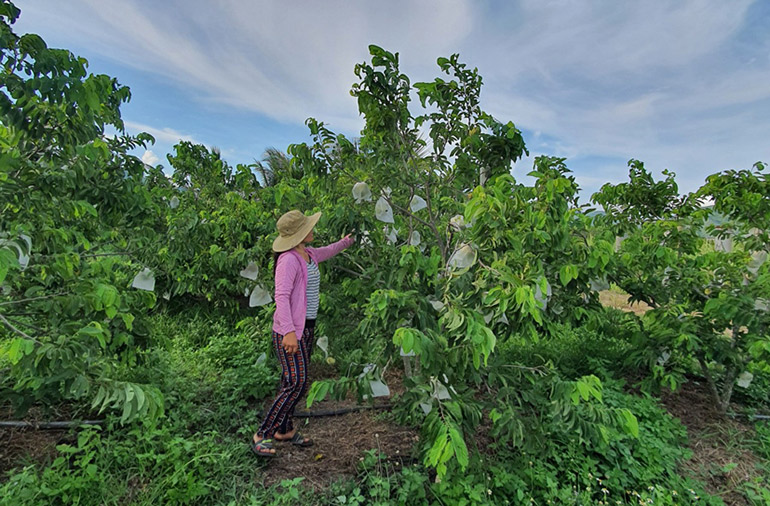 Chị Lê Thị Kim Gấm ở buôn Hố Hầm, một trong những hộ gia đình tham gia dự án, cho biết: “Với số tiền hiện có của gia đình, cộng với vốn vay thêm từ dự án, gia đình tôi đã cải tạo 1ha đất để triển khai mô hình trồng cây ăn trái như: bưởi da xanh, dừa xiêm, mãng cầu, mít thái… Sau 2 năm canh tác, gia đình đã thu hoạch và có thu nhập ổn định”.