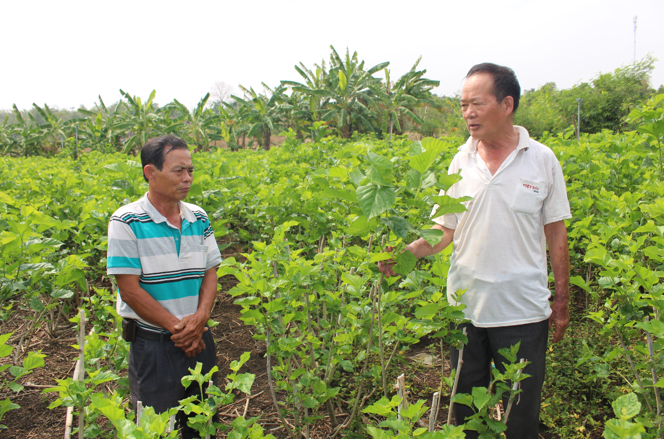 Ông Dẩu (bên phải) chia sẻ kinh nghiệm trồng dâu nuôi tằm với người dân địa phương. |