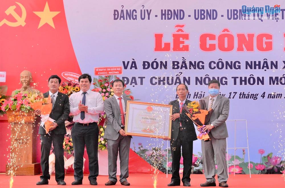 Dịp này, cán bộ và nhân dân xã Bình Hải đón nhận Bằng khen của UBND tỉnh vì đã có thành tích trong việc xây dựng địa phương đạt chuẩn NTM. UBND huyện Bình Sơn tặng giấy khen cho 6 tập thể và 6 cá nhân ở xã Bình Hải có thành tích trong xây dựng NTM.