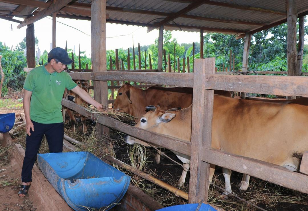 Anh Hoàng Văn Giáp (thôn 10B, xã Cư Amung, huyện Ea H'leo) đang chăm sóc đàn bò của gia đình. |