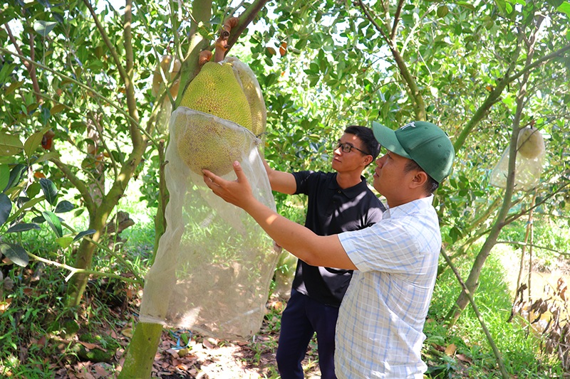 Anh Trần Hồ Quyết Tiến (bìa phải) và anh Nguyễn Phương Nam “rủ nhau” về quê lập nghiệp với mô hình trồng mít theo tiêu chuẩn VietGAP
