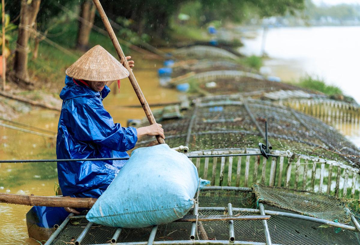 Anh Nguyễn Thượng Uyển đội mưa kiếm cỏ cho 3 lồng cá