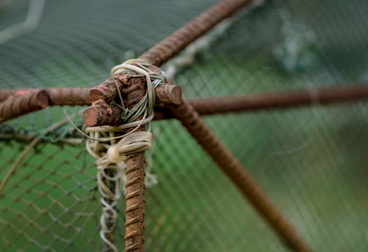 Ngay cả lồng làm bằng cọc thép cũng được gia cố nhiều lớp dây, tránh thất thoát cá