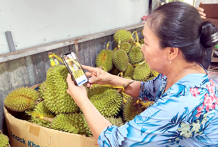 Nhiều hợp tác xã, nông dân ở ĐBSCL đã ứng dụng mã QR để truy xuất nguồn gốc sản phẩm. Trong ảnh: Thao tác truy xuất nguồn gốc sản phẩm OCOP sầu riêng chị Thảo (TP Cần Thơ).
