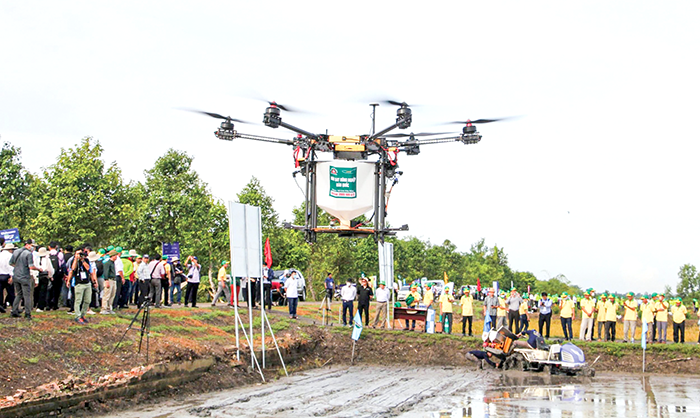 Trình diễn máy bay không người lái ứng dụng trong sản xuất lúa tại Viện Lúa ĐBSCL. Ảnh: MỸ THANH