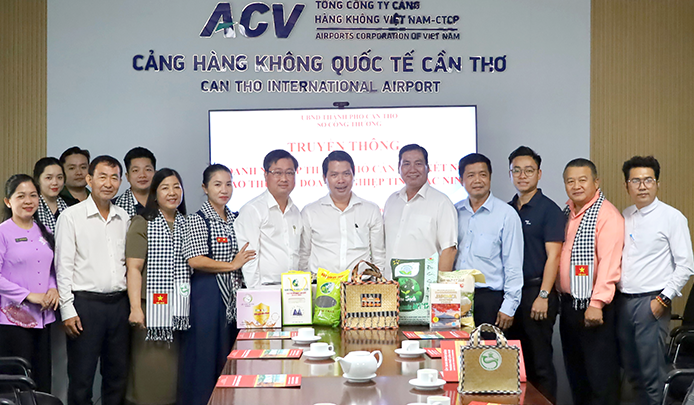 Lãnh đạo ngành Công Thương thành phố, đại diện Cảng Hàng không Quốc tế Cần Thơ cùng các doanh nghiệp tham gia sự kiện chụp hình lưu niệm.