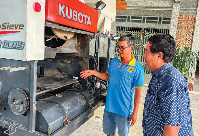 Các thành viên của HTX Thịnh Phát trao đổi tình hình cung cấp máy gặt thực hiện dịch vụ thu hoạch lúa.