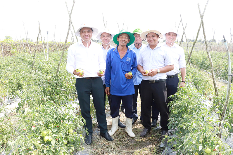Đồng chí Nguyễn Hùng Cường - Phó Bí thư Thường trực Huyện ủy Cao Lãnh (bìa trái) thăm mô hình trồng cà chua theo hướng hữu cơ của hộ ông Nguyễn Văn Mảnh ngụ xã Phong Mỹ, huyện Cao Lãnh