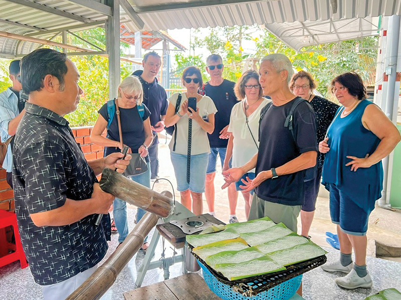 Du khách tham quan, trải nghiệm làm bánh hỏi tại Cơ sở bánh hỏi mặt võng Út Dzách, xã Nhơn Ái.