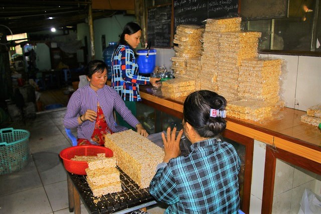 Tuy mới hơn 4 giờ sáng nhưng nhân công tại Cơ sở sản xuất cốm Thanh Thanh Thúy (xã Tân Thành, huyện Lai Vung) đã làm việc để kịp hàng giao cho khách. Bà Lâm Mỹ Thạnh - chủ cở sở cho biết: “Từ tháng trước, cơ sở đã chuẩn bị thu mua nguyên liệu và liên hệ lao động nhằm chủ động cho vụ sản xuất Tết Nguyên đán. Những ngày này cận tết, do nhu cầu thị trường tăng nên việc sản xuất của cơ sở phải tăng gấp 2 lần ngày thường. Để đa dạng hóa sản phẩm, cơ sở cho ra sản phẩm mới là cốm gạo hạt điều, hạt sen, hạt bí”.