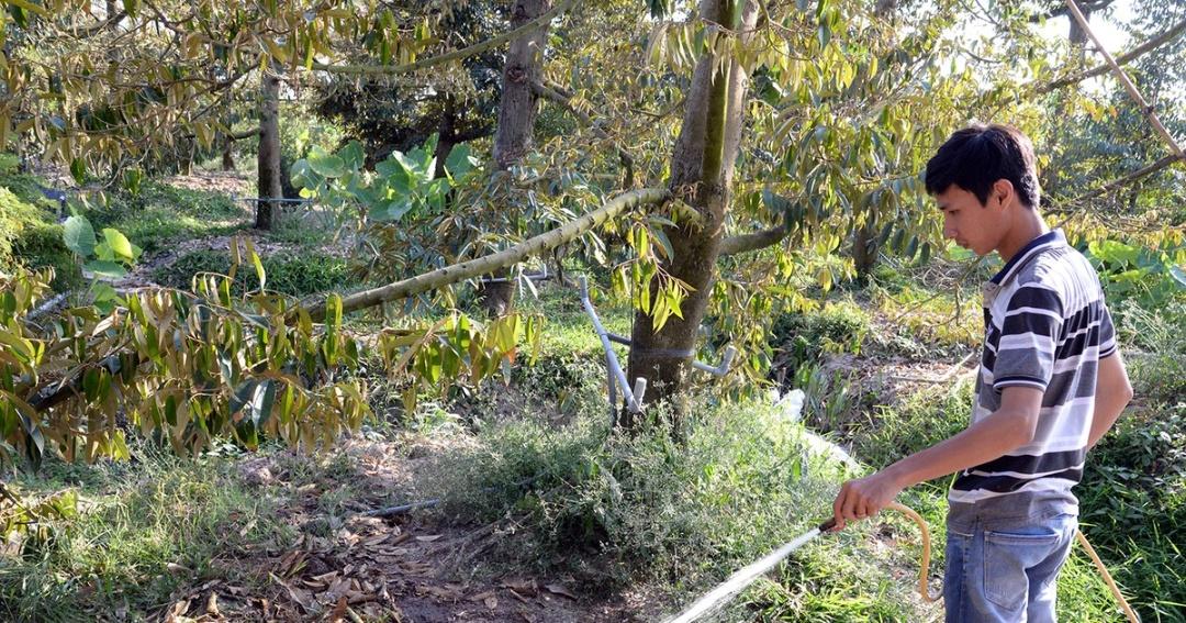 Người dân xã An Cư, huyện Cái Bè, tỉnh Tiền Giang chăm sóc sầu riêng.