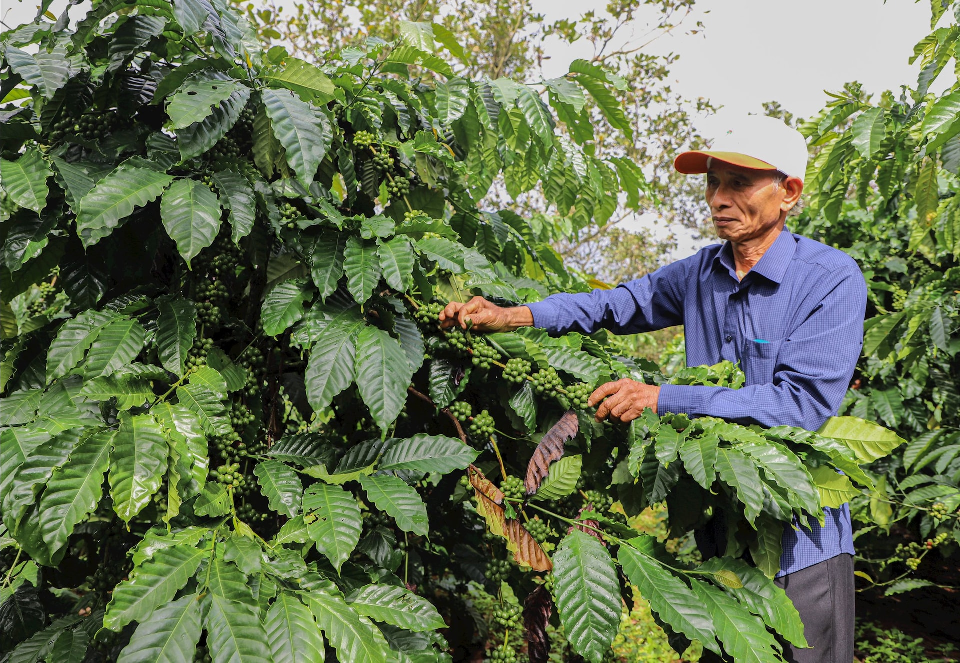 Ông Điểu K’Rắk chăm lo canh tác cà phê, điều, sầu riêng mang lại nguồn thu nhập khá