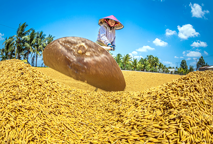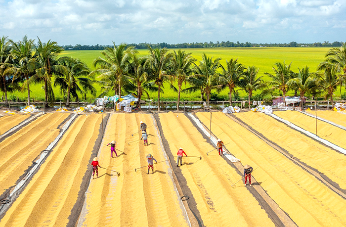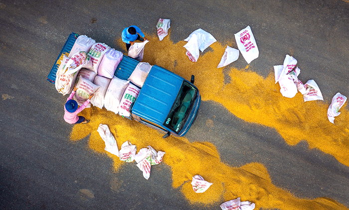 Góc nhìn từ trên cao ghi lại khoảnh khắc những chiếc xe lúa cập bến, bắt đầu công đoạn phơi khô để giữ trọn chất lượng hạt gạo.