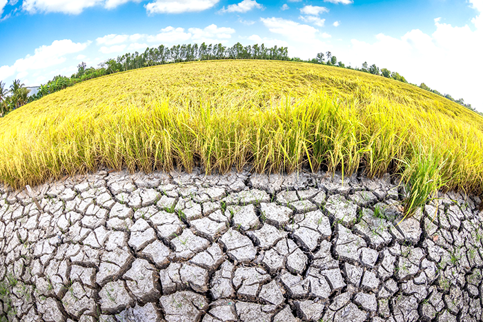 Nắng hạn kéo dài khiến nền đất nứt nẻ và làm nhiều vạt lúa bị đổ ngã, minh chứng cho sự khắc nghiệt của thời tiết mà người nông dân phải đối mặt năm nay.