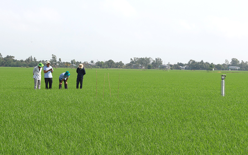 Tham gia thực hiện mô hình canh tác lúa chất lượng cao phát thải thấp gắn với tăng trưởng xanh, THT Mỹ Nam 2 có 66 hộ với diện tích 100ha. Nông dân trong THT áp dụng đúng quy trình, canh tác giống lúa OM18, giảm lượng giống xuống còn 100kg/ha, áp dụng đồng bộ cơ giới hóa 100%, thực hành tốt canh tác ngập khô xen kẽ. Hiện tại, lúa hơn 60 ngày tuổi, đang trong giai đoạn đòng trổ, ông Nguyễn Thanh Bình - thành viên THT Mỹ Nam 2 phấn khởi cho biết: “Lúc trước, ruộng lúa không có bệnh cũng phun ngừa nên chi phí cao, còn giờ thì khi nào lúa có bệnh mới phun nên chi phí phân thuốc giảm nhiều”.