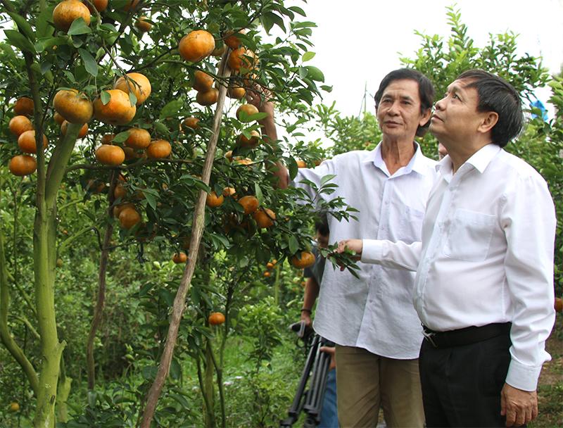 Đồng chí Phan Văn Thắng - Phó Bí thư Tỉnh ủy, Chủ tịch Ủy ban Mặt trận Tổ Quốc Việt Nam tỉnh Đồng Tháp (bìa phải) đánh giá cao tiềm năng của Vườn quýt hồng Văn Tánh