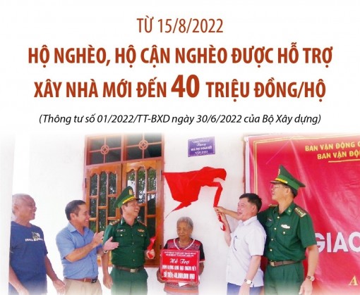 Từ 15/8/2022, chính sách mới liên quan đến việc hỗ trợ nhà ở cho hộ nghèo, hộ cận nghèo trên địa bàn các huyện nghèo được chính thức áp dụng theo quy định tại Thông tư số 01/2022/TT-BXD ngày 30/6/2022 của Bộ Xây dựng. Theo đó, hộ nghèo, hộ cận nghèo được hỗ trợ xây nhà mới hoặc sửa chữa nhà ở ký cam kết và đăng ký với UBND cấp xã, đề xuất chọn mẫu nhà, phương thức xây mới hoặc sửa chữa. Định mức trong trường hợp này là 40 triệu đồng/hộ/nhà xây mới; 20 triệu đồng/hộ/sửa chữa nhà từ nguồn ngân sách Trung ương.