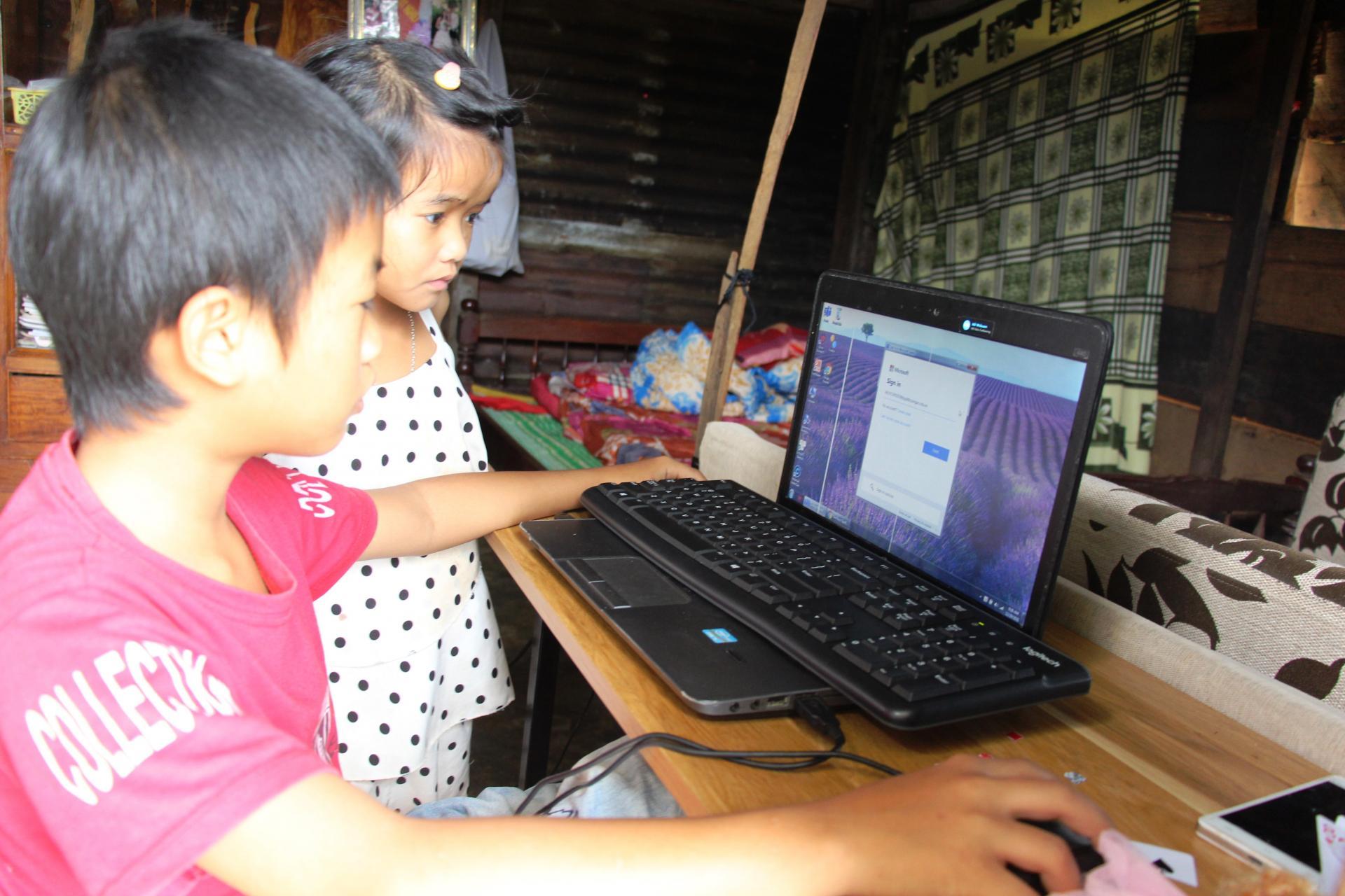 Em Nguyễn Đức Viễn và Nguyễn Thị Ngọc Diệp thôn Tiến Thịnh, xã Quảng Tiến học trực tuyến bằng máy tính được tặng. |